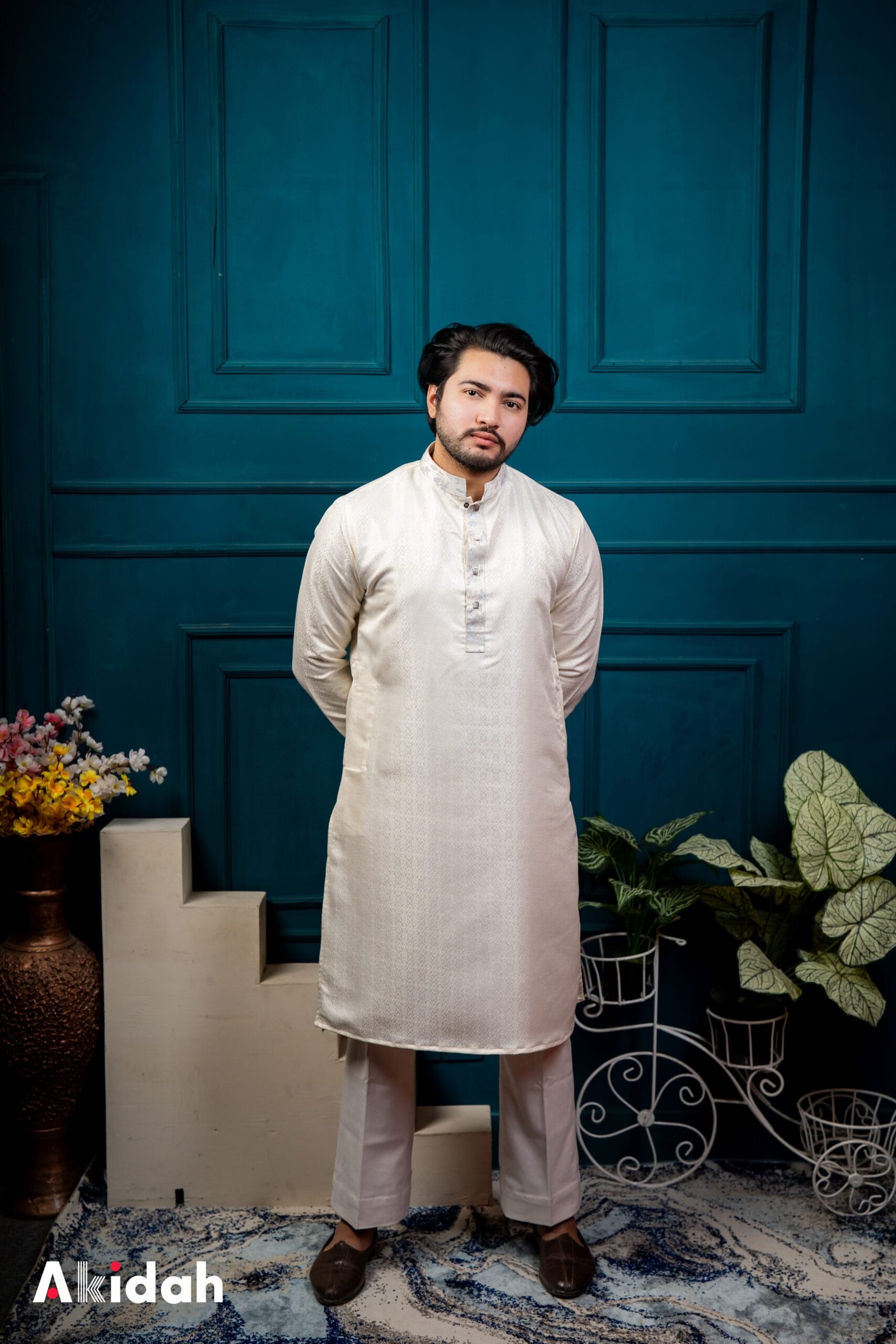 The Akidah Signature: Cream Pearl Panjabi is crafted from pure jacquard fabric, offering a luxurious texture with a graceful and refined finish. The intricate woven design enhances its elegant appeal, while the soft, premium feel ensures lasting comfort. A timeless piece designed for those who appreciate subtle sophistication in their traditional wear.