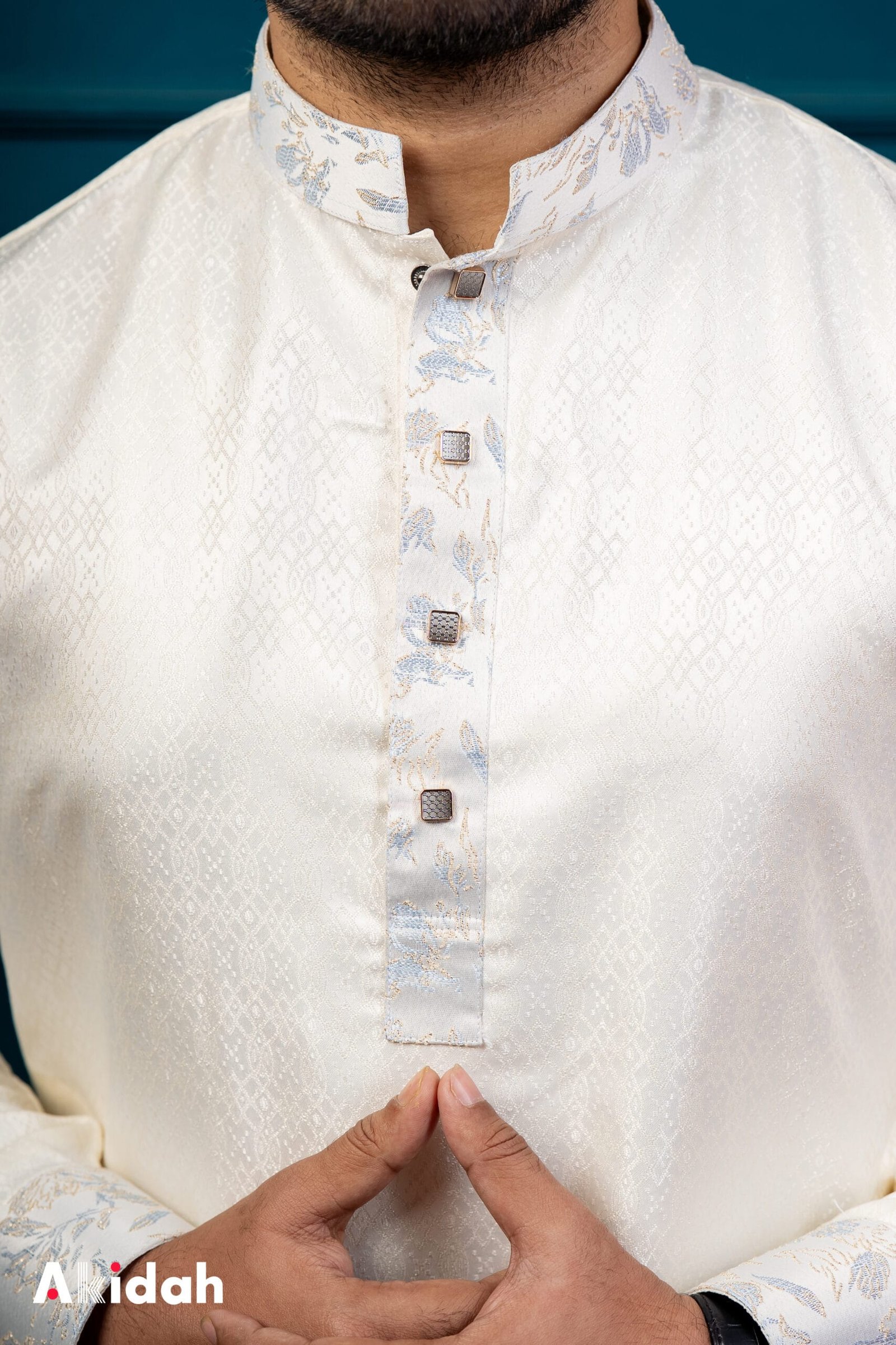 Crafted from pure jacquard fabric, the Akidah Signature: Cream Pearl Panjabi offers a refined texture with an elegant, timeless look — perfect for sophisticated traditional styling.
