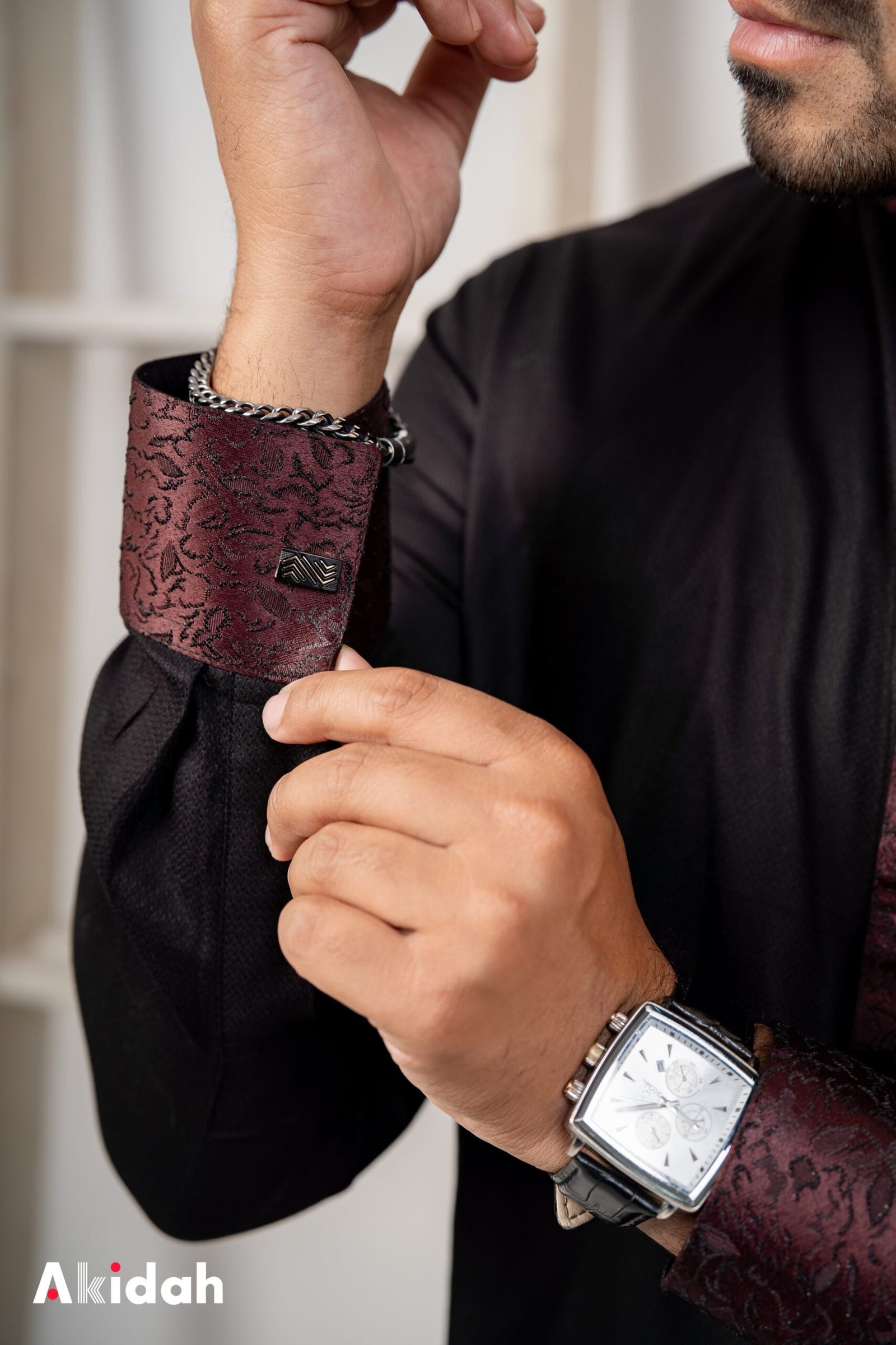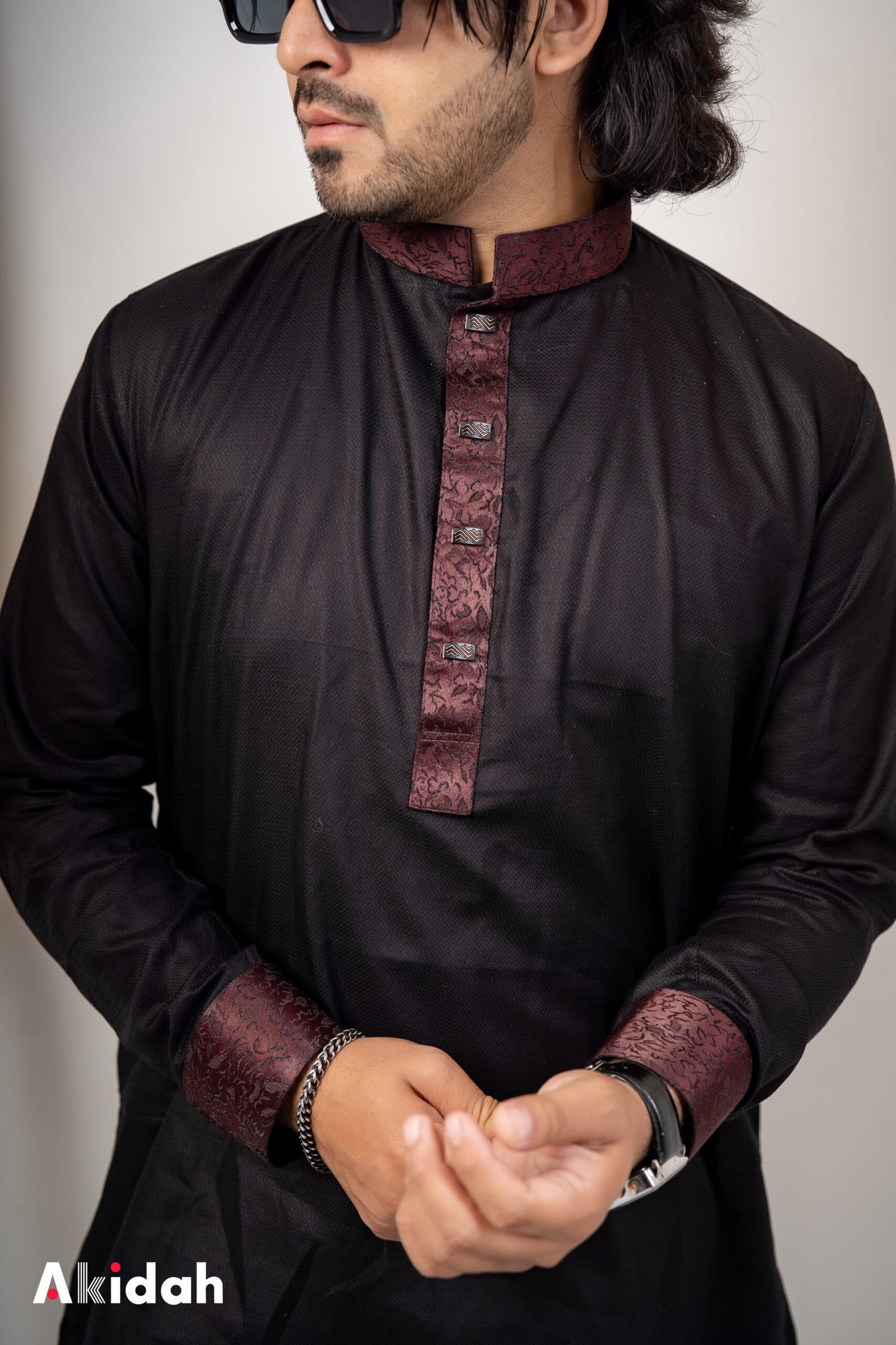 This Crimson Black Panjabi is crafted from a premium cotton and polyester blend, offering comfort with a refined finish. Designed with Katan fabric detailing on the collar and cuffs, it adds a subtle touch of richness and structure to the overall look — making it ideal for both special occasions and polished everyday wear.