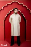 A refined Sandstone Beige jacquard Panjabi featuring elegant embroidery on the collar and cuffs, with textured woven fabric for a sophisticated traditional look.