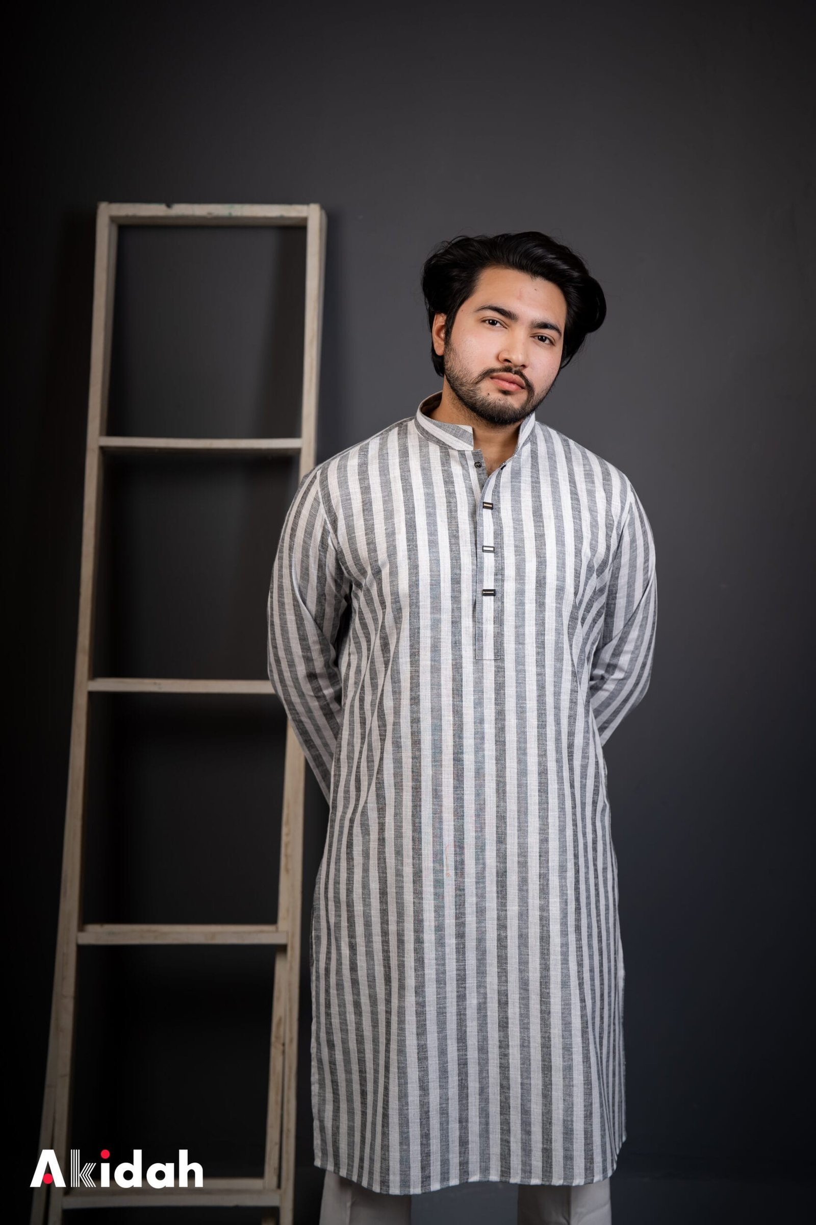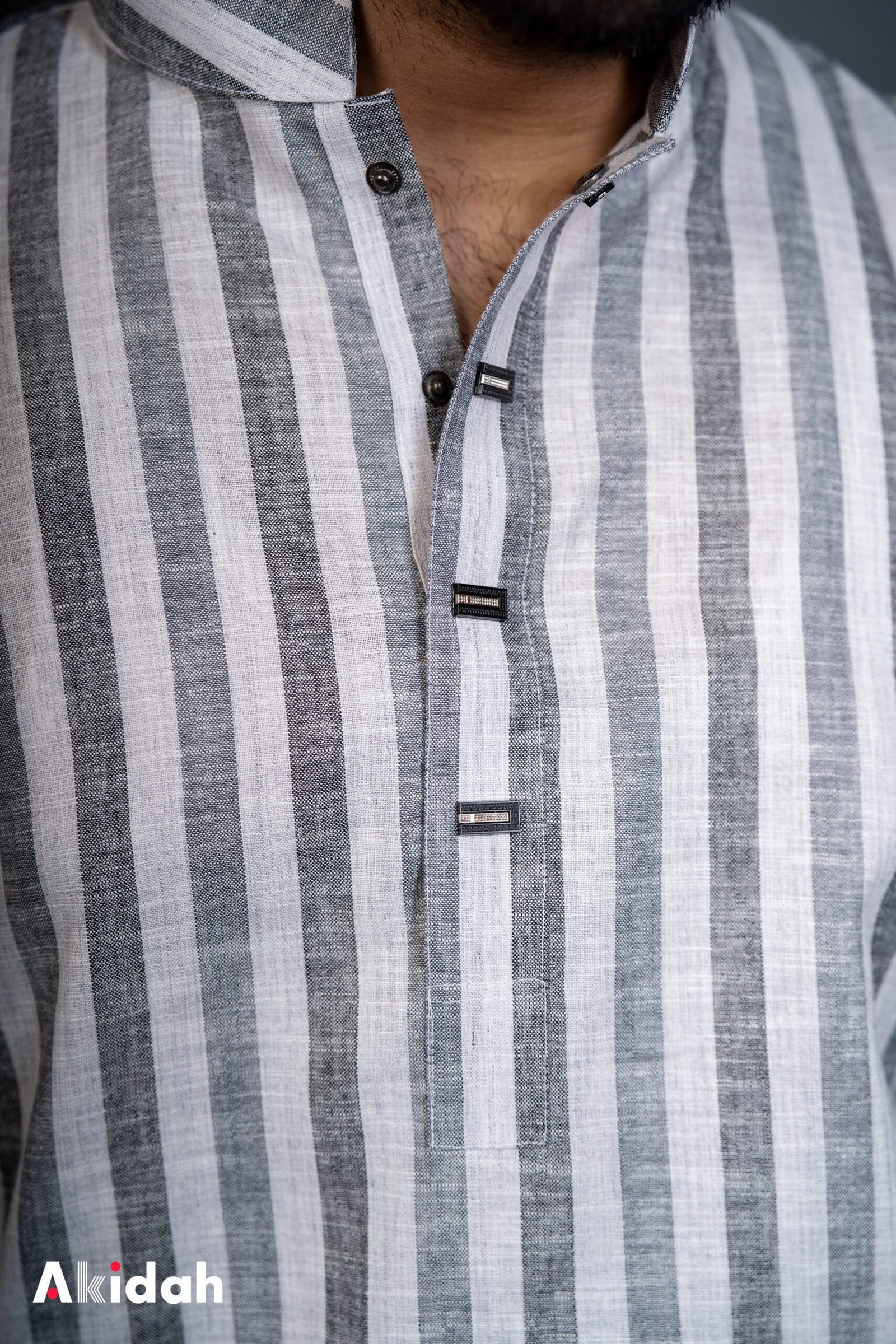 A Steel Grey Panjabi made from 100% linen striped fabric, combining breathability with a refined modern look.