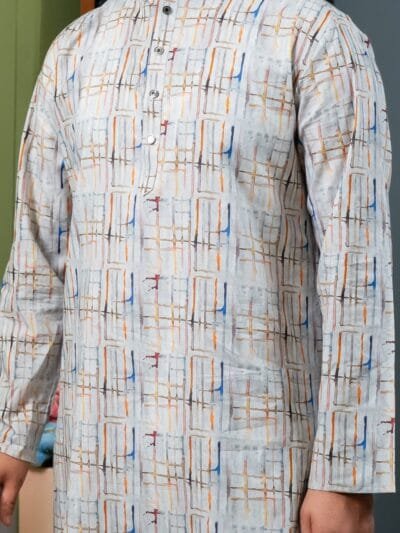 Radiant Grid: Teal Azure Panjabi made from a cotton-polyester blend, combining comfort, durability, and refined modern style.